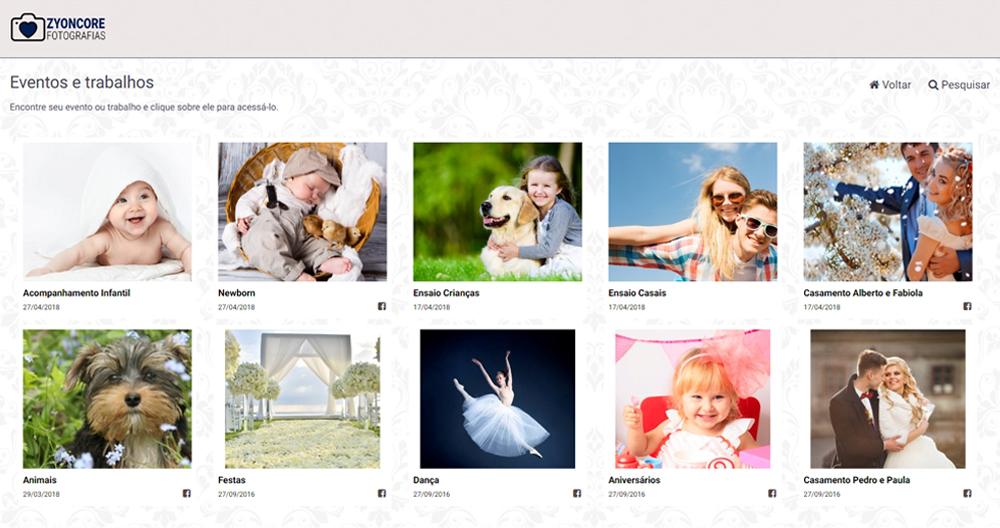 Seus clientes terão acesso as fotos de um determinado evento através do seu site utilizando um nome de usuário e senha predefinido por você. Eles poderão visualizar e comprar as imagens exibidas.
